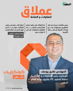 وأضاف: “تُشارك كونكريت بلس مع تحالف الستوم الفرنسية للمنافسة على مشروعات قطار القاهرة الإسكندرية، وسكك حديد الروبيكى، وطنطا ــ المنصورة وكلها مشروعات ممولة بالعملة الأجنبية”.