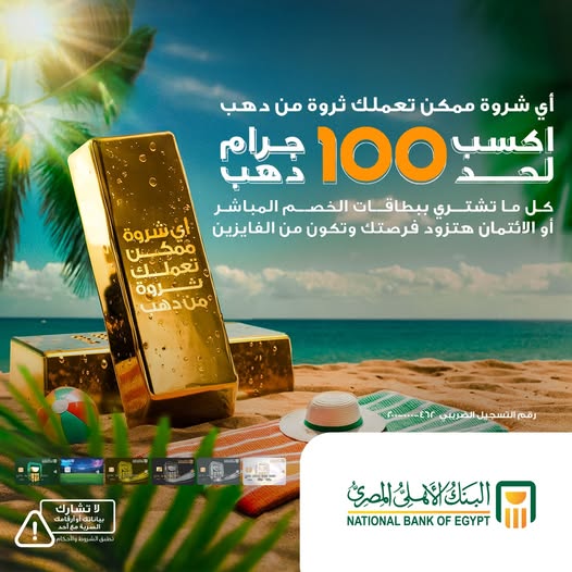 وقال البنك الأهلي المصري: “أي شروة ممكن تعملك ثروة من دهب! اشتري دلوقتي مع عرض الصيف من البنك الأهلي المصري ببطاقاتك الائتمانية أو الخصم المباشر وممكن تكسب سبيكة دهب لحد 100 جرام وكل ما تصرف أكتر فرصك في الفوز بتكتر”.
