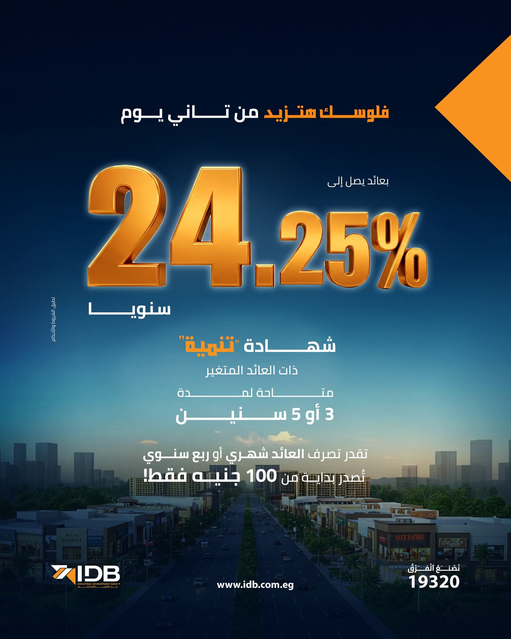 أعلن بنك التنمية الصناعية (IDB) عن طرح شهادة “تنمية” التي تقدم عوائد تنافسية تصل إلى 24.25% سنويًا، لمدة 3 أو 5 سنوات، مع خيارات عائد شهري أو ربع سنوي. وتبدأ قيمة الشهادة من 100 جنيه فقط، ما يفتح الباب أمام شرائح واسعة من العملاء للادخار والاستثمار، في ظل سعي البنوك المصرية لتوفير حلول ادخارية متميزة تتناسب مع متطلبات العملاء المختلفة.