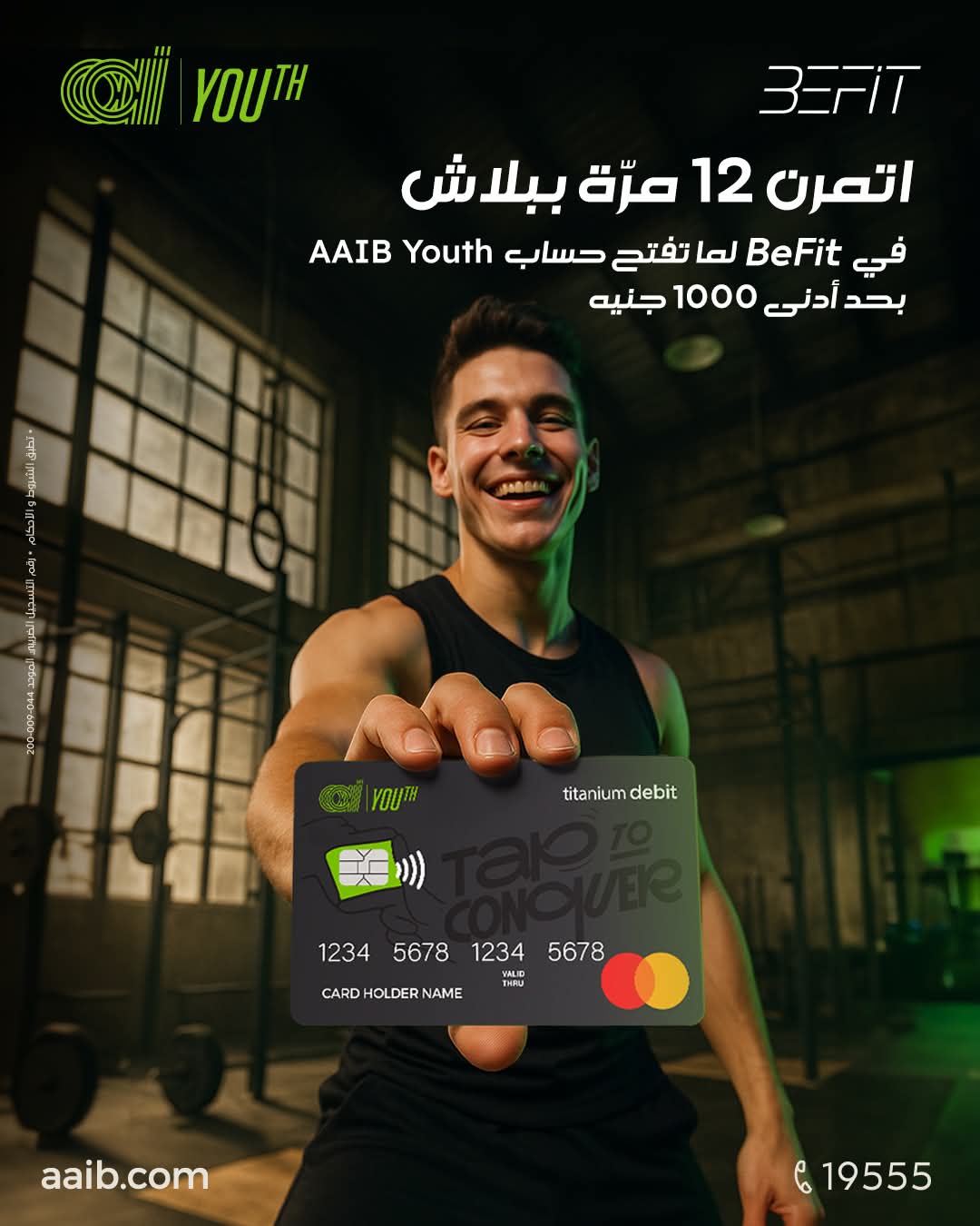 أعلن البنك العربي الأفريقي الدولي عن إطلاق عرض حصري لعملاء حساب الشباب، يتيح لهم الاستمتاع بـ 12 جلسة تدريب مجانية في الـ Group Sessions مع BEFIT، وذلك عند فتح حساب جديد بحد أدنى 1000 جنيه.