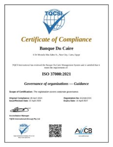 أعلن بنك القاهرة عن تجديد اعتماد شهادة الأيزو ISO 37000 في مجال الحوكمة المؤسسية، للعام الثاني على التوالي، في خطوة تعكس حرص البنك على مواءمة أنظمته وإجراءاته مع المعايير الدولية المعتمدة، وذلك في تأكيد جديد على التزامه بتطبيق أعلى معايير الشفافية والكفاءة.