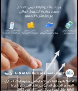 أعلن البنك الأهلي الكويتي – مصر عبر صفحته الرسمية على موقع التواصل الاجتماعي “فيسبوك”، عن مشاركته في الاحتفال بـاليوم العالمي للادخار، من خلال تقديم مجموعة من الخدمات المصرفية المجانية والمزايا الحصرية، وذلك ضمن مبادرة الشمول المالي التي أطلقها البنك المركزي المصري.