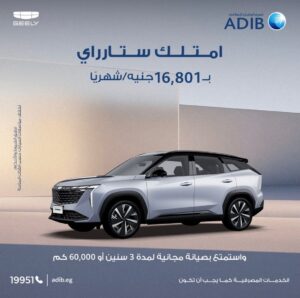 أعلن مصرف أبوظبي الإسلامي – مصر (ADIB Egypt) إتاحة برنامج تمويل جديد لشراء سيارة Geely Starray من خلال شركة أوتوموبيلتي، بقسط شهري يبدأ من 16,801 جنيه، في إطار حرصه على تقديم حلول تمويلية مرنة تلبي احتياجات العملاء المختلفة.