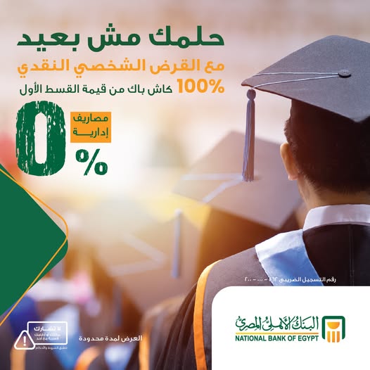 يواصل البنك الأهلي المصري إطلاق حملته التمويلية المميزة تحت شعار “حلمك مش بعيد”، التى تتيح للعملاء الحصول على قرض شخصي نقدي أو قرض سيارة غير مضمون بدون أي مصاريف إدارية، مع ميزة استرداد كامل قيمة القسط الشهري الأول 100% كاش باك بعد سداده بالكامل ضمن شروط الاستحقاق.