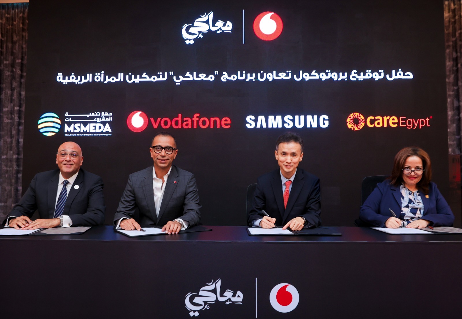 وقع بروتوكولات التعاون كل من السيد/محمد عبد الله، الرئيس التنفيذي والعضو المنتدب لشركة ڤودافون مصر والرئيس الإقليمي للأسواق الدولية بمجموعة ڤوداكوم، والسيد/باسل رحمي، الرئيس التنفيذي لجهاز تنمية المشروعات المتوسطة والصغيرة ومتناهية الصغر، والسيد/ بيونجمو (ثيو) شين الرئيس والمدير التنفيذي لشركة سامسونج إلكترونيكس مصر ، والسيدة/ ڤيڤيان ثابت، الرئيس التنفيذي لمؤسسة كير مصر للتنمية.