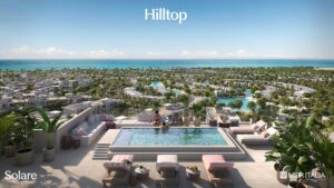 تستوحي”هيل توب – Hilltop” طرازها المعماري من الأسلوب العصري لمدينة ميامي وتستمد أسلوب الحياة فيها من مدن البحر الأبيض المتوسط ، وقد تم تصميمها على ارتفاعات متدرجة تتراوح بين 26 و36 مترًا فوق مستوى سطح البحر، مما يمنح وحداتها إطلالات بانورامية خلابة وواسعة على البحر، ويوفر أعلى مستويات الخصوصية. تضم هذه المرحلة أكثر من 5000 متر مربع من البحيرات الصناعية الصالحة للسباحة (Swimmable Lagoons)، ما يمنح كل مبنى شاطئه الخاص. وتشمل المرحلة وحدات سكنية تتنوع بين غرفتين وثلاث غرف نوم، وتتميز بوجود حمامات سباحة خاصة، بالإضافة إلى “رووف توب كلوب هاوس – Rooftop Clubhouse”، الذي يمثل أعلى نقطة في المشروع ويوفر إطلالة مذهلة. كما تنفرد “هيل توب” بقربها من منطقة “سولاري داون تاون”، والتي يتم تطويرها باستثمارات ضخمة تُقدَّر بحوالي 10 مليارات جنيه، لتصبح المركز التجاري والترفيهي والسياحي الرئيسي لمدينة رأس الحكمة على مساحة 40 فدانًا، ومن المتوقع أن تستقطب حوالي 30,000 زائر يوميا.