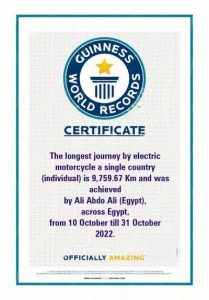 وتحقق الرقم الأول للمغامر المصري بتسجيله “أطول رحلة على دراجة كهربائية داخل دولة”، وذلك بعد أن قطع مسافة 9,759 كيلو خلال 22 يوما من انطلاق الرحلة، وهو رقم قياسي جديد أول مرة يتم تسجيله في موسوعة جينيس للأرقام القياسية.