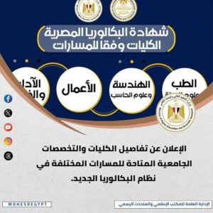 في إطار جهود تطوير منظومة التعليم المصرية، أعلنت وزارتا التربية والتعليم والتعليم الفني، والتعليم العالي والبحث العلمي، عن تفاصيل الكليات والتخصصات الجامعية المتاحة للمسارات المختلفة في نظام البكالوريا الجديد، ويأتي هذا الإعلان ضمن المساعي المتواصلة لضمان مستقبل تعليمي أفضل لشباب مصر، وتوفير خيارات متنوعة تتناسب مع ميول وقدرات الطلاب ومتطلبات سوق العمل، وتؤكد الوزارتان على أن هذا التوضيح المبكر للمسارات والتخصصات يأتي في إطار حرصهما على توفير أقصى درجات الشفافية والتوجيه للطلاب وأولياء الأمور.