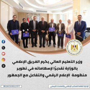 كرم الدكتور أيمن عاشور وزير التعليم العالي والبحث العلمي، فريق الإدارة العامة للمكتب الإعلامي والمتحدث الرسمي للوزارة؛ تقديرًا لما حققته المنظومة الإعلامية للوزارة من أداء متميز خلال الفترة الماضية، ودورها في تطوير أدوات التواصل الرقمي وتعزيز التفاعل مع جمهور الوزارة، وقد شهدت الصفحة الرسمية للوزارة على موقع التواصل الاجتماعي فيس بوك تطورا ملحوظا ، حيث سجلت أكثر من ١٠ ملايين مشاهدة خلال ٢٨ يومًا فقط، بنسبة نمو بلغت ٢٦٪ مقارنة بالفترة السابقة.