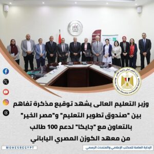 شهد د.أيمن عاشور وزير التعليم العالي والبحث العلمي، مراسم توقيع مذكرة تفاهم بين صندوق تطوير التعليم التابع لمجلس الوزراء، ومؤسسة مصر الخير، بالتعاون مع هيئة التعاون الدولي اليابانية (جايكا)، وتهدف مذكرة التفاهم إلى التعاون المشترك في تقديم دعم سنوي لعدد100 طالب من طلاب معهد الكوزن المصري الياباني بمدينة العاشر من رمضان بمحافظة الشرقية، بدءًا من العام الأكاديمي 2025/2026، من خلال تقديم منح جزئية تخصص لدعم الطلاب المتميزين، والأكثر احتياجًا، وأكد الوزير أن توقيع مذكرة التفاهم اليوم مع مؤسسة مصر الخير يجسد نموذجًا للتكامل بين مؤسسات الدولة، والمجتمع المدني، والشركاء الدوليين من أجل دعم التعليم التكنولوجي، بما يتماشى مع رؤية مصر 2030 والجمهورية الجديدة، مشيرًا إلى أن هذا التعاون يمثل خطوة مهمة في دعم طلاب معهد الكوزن المصري الياباني (EJ-KOSEN)، الذي يعد أحد الصروح الواعدة في مجال التعليم التطبيقي والتكنولوجي بالشراكة مع الجانب الياباني، وبما يعزز من قدرات شبابنا، ويدعم الطلاب المتميزين والفئات الأكثر احتياجًا، مؤكدًا تطلعه إلى المزيد من هذه المبادرات التي تفتح آفاقًا جديدة للتنمية، وبناء الإنسان المصري.