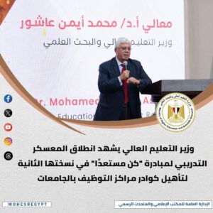 شهد د.أيمن عاشور وزير التعليم العالي والبحث العلمي انطلاق فعاليات المعسكر التدريبي لكوادر مراكز التوظيف بالجامعات المصرية، والمقرر عقده خلال الفترة من 20 – 26 يوليو الجاري، والذي يمثل المرحلة الثانية من الخطة التنفيذية للنسخة الثانية من مبادرة “كن مستعدًا: مليون مؤهل مبتكر”، وخلال فعاليات المؤتمر، أكد الوزير أن النسخة الثانية من مبادرة “كن مستعدًا” تأتي في إطار دعم الطلاب من خلال منظومة شاملة تلبي احتياجاتهم من المهارات والجدارات المطلوبة لسوق العمل، موجهًا الشكر للقيادة السياسية على رعايتها للمبادرة، مشيرًا إلى تكامل المبادرة مع الإستراتيجية الوطنية للتعليم العالي والبحث العلمي ٢٠٣٠، موضحًا أن المبادرة تجسد إيمان الدولة بدور الشباب كمحرك للتنمية، وتهدف إلى تأهيل مليون طالب وخريج عبر منصة رقمية شاملة تتيح مسارات متنوعة للتأهيل المهني والابتكاري.