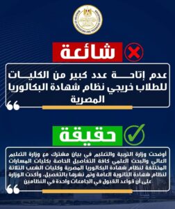 تكافؤ فرص القبول بالجامعات: نفت الوزارة شائعة حرمان خريجي البكالوريا المصرية من دخول بعض الكليات، موضحة أن القواعد المطبقة على القبول الجامعي واحدة في النظامين.