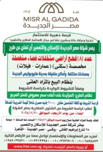 كشفت شركة مصر الجديدة للإسكان والتعمير عن فرص ذهبية للمستثمرين حيث أعلنت عن طرح عدد (8) قطع أراضي فضاء للبيع داخل مدينة هليوبوليس الجديدة في مزايدة علنية.