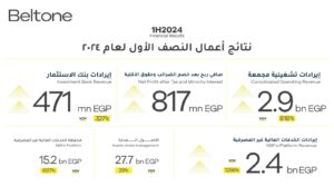 نجحت بلتون القابضة في الحفاظ على مسارها الاستثنائي للنمو خلال النصف الأول من العام الحالي محققة إيرادات تشغيلية بقيمة 2.9 مليار جنيه بنسبة نمو سنوي 818%، محققة صافي ربح بقيمة 817 مليون جنيه بعد خصم الضرائب وحقوق الأقلية، مقارنة بخسارة قدرها 146 مليون جنيه خلال النصف الأول من عام 2023، وجاءت هذه النتائج غير المسبوقة بفضل الأداء القوي لكل من قطاعي بنك الاستثمار والخدمات المالية غير المصرفية مما أسفر عن نمو هامش صافي الربح التشغيلي إلى 64%.