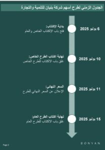 وكشفت عن أنه سيتم فتح باب الاكتتاب في الطرحين العام والخاص يوم 6 يوليو الجاري وسيتم غلق باب الاكتتاب الخاص يوم 10 يوليو الحالي، والاعلان عن نسبة التخصيص يلي ذلك الإعلان عن السعر النهائي للطرح يوم 11 يوليو، وسيتم يوم 15 يوليو الجاري غلق الاكتتاب العام و الإعلان عن نتائج نسبة التخصيص
