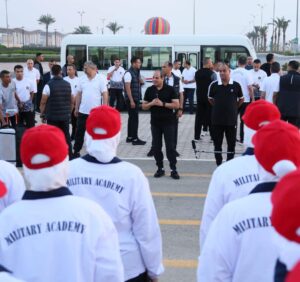 وذكر السفير محمد الشناوي، المتحدث الرسمي، أن الرئيس تابع عقب ذلك الطابور الصباحي للياقة البدنية لطلاب الأكاديمية، حيث أشاد سيادته في هذا الصدد بالمستوى الرفيع الذي يتمتع به الطلاب من حيث اللياقة البدنية والثقة بالنفس، والذي انعكس جليًا في أدائهم خلال التدريبات، كما شارك  الرئيس طلاب الأكاديمية العسكرية قي تناول وجبة الإفطار، حيث تبادل الحوار مع طلاب الاكاديمية، وتم التأكيد في هذا السياق على أهمية التفاني في التدريب والتحصيل العلمي، إلى جانب ضرورة الوعي بما يحيط مصر من أحداث محلية، وأزمات إقليمية، وتطورات دولية.