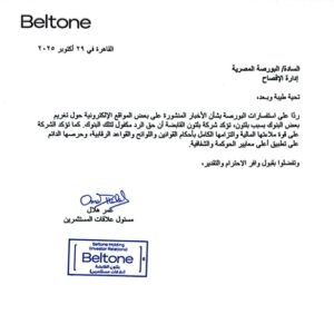 في خطاب رسمي موجّه إلى إدارة الإفصاح بالبورصة المصرية، أكدت شركة بلتون القابضة ردها على الاستفسارات المتعلقة بالأخبار المنشورة على بعض المواقع الإلكترونية حول تغريم بعض البنوك بسبب بلتون.