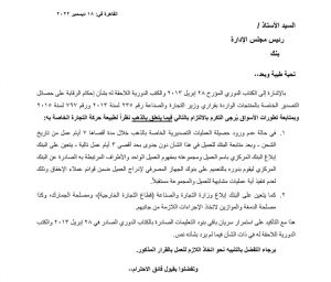 وشدد المركزي على ضرورة قيام البنك بإبلاغ وزارة التجارة والصناعة (قطاع التجارة الخارجية)، ومصلحة الجمارك، ومصلحة الدمغة والموازين لاتخاذ الإجراءات اللازمة من جانبهم.